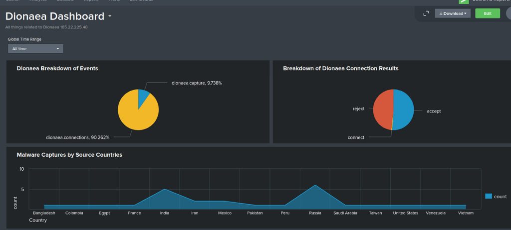- Malware collection: Malware-focused honeypots (Dionaea, ADBHoney) trap actual malicious binaries and exploit code. Captured malware can be reverse-engineered in a safe environment. Researchers gain insight into active threats (even zero-day exploits) from the collected samples.