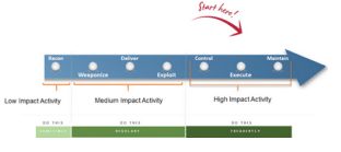 For example, the rightmost stages of MITRE’s seven-stage ATT&CK lifecycle (Control, Maintain, and Execute) can be considered High Impact activity. The higher impact activity the more that it should be hunted for on a more regular basis. Here’s an example of weekly hunting sprints over two months: